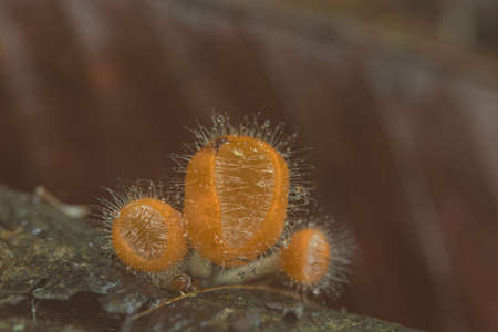 Champagne (red hairy cup fungi) mushrooms in rain forest, Thailand. Take photos by close up view.