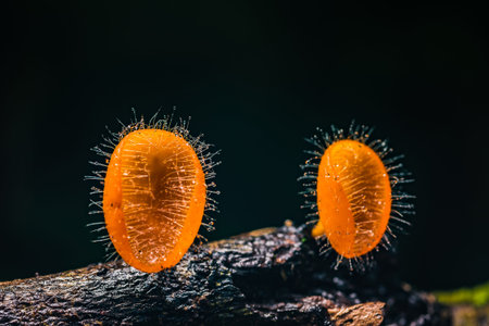 Orange mushroom ,Champagne mushroom or eyelash cup mushroom with sparkling droplets in the forest. Ecosystem or biological diversity concept.