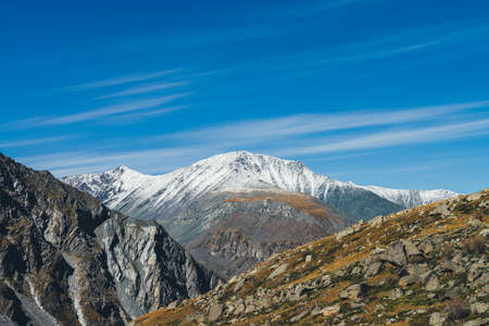 Colorful alpine landscape with great mountain in autumn colors with snow on peak in sunshine under cirrus clouds in blue sky. Picturesque autumn scenery with sunlit rocks and snow-covered mountain top