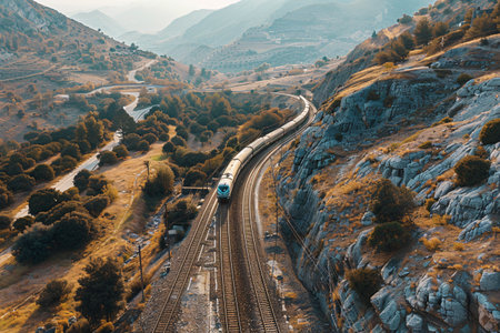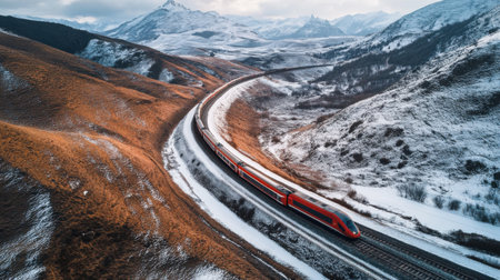Generative AI A top-view perspective of a train passing through snow-covered mountain passes, emphasizing the railway's connection through challenging terrain.