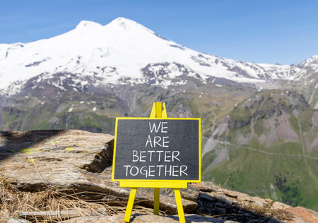 We are better together symbol. Concept words phrase We are better together on beautiful black blackboard. Beautiful mountain Elbrus background. Business We are better together concept. Copy space.