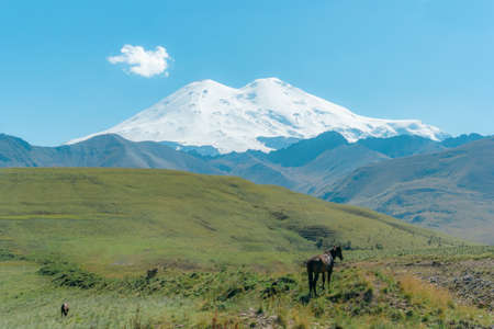 Scenic view of the highest peak in Europe, mount Elbrus with green hills on a Sunny summer day.