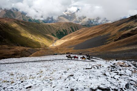Packhorses going up the path to the Atsunta Pass in Georgia