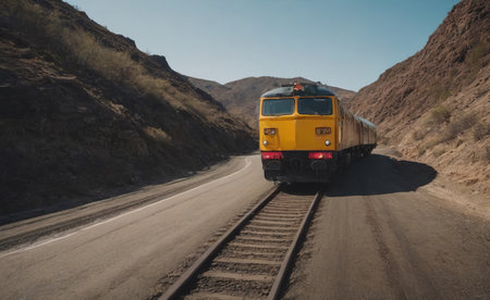 A vibrant yellow train travels along a winding railway through a narrow canyon, flanked by steep cliffs and rocky formations under a clear sky, creating a striking contrast with the landscape.