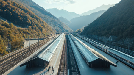 The train station features contemporary design amidst stunning mountain landscapes. Passengers wait and walk along platforms surrounded by lush foliage and towering peaks.