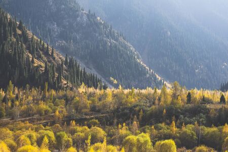 Beautiful landscape, autumn yellow forest and mountains. Kazakhstan.