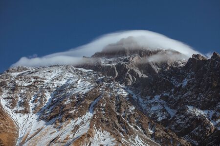 The top of the mountain in a hat from the cloud. Caucasus mountains.