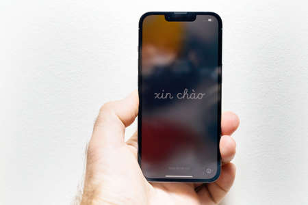 iPhone 13 Pro Max with Xin Chao text translated from Vietnamese as hello