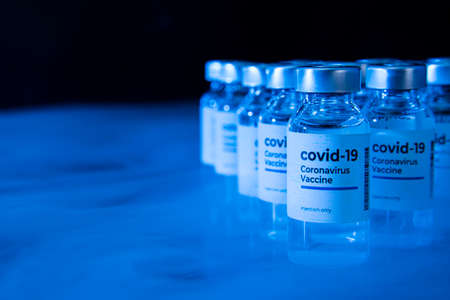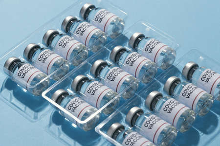 Coronavirus vaccine in glass vials on a blue background