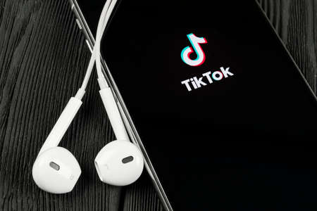 Tver, Russia-August 5, 2020, the tik tok logo on the smartphone screen on a light background with large headphones. Tik-Tok icon. logo of the current app. Tiktok social network.