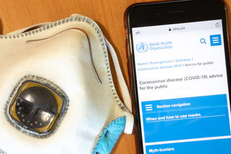 Saint Petersburg, Russia - 17 March 2020: Respirator mask with World Health Organization page on phone screen top view. Covid-19 or Coronavirus info on Who.int website, Illustrative Editorial.