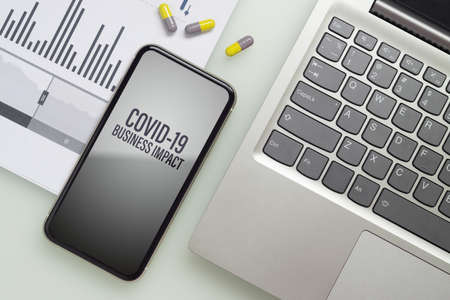 Coronavirus Covid-19 pandemic outbreak business impact background concept. Mockup mobile phone with laptop, business charts and medical tablets on working table for covid 19 business financial risk.