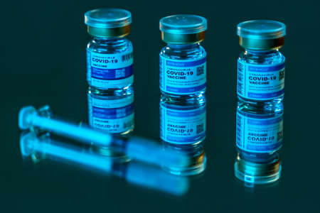 Coronavirus COVID-19 Vaccine Vials and Syringe On Reflective Surface.