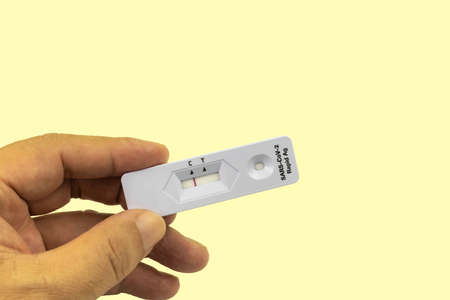 Antigen rapid test, medical device in hand used to test on yellow background.