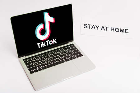 KYIV, UKRAINE - APRIL 8, 2020: laptop with tik tok website on screen near paper with stay at home lettering on white