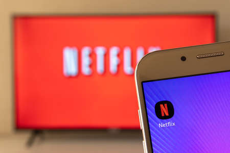Sao Paulo/SP/Brazil - 08/01/2020: NETFLIX app logo on smartphone screen with open app in the background on Smart TV