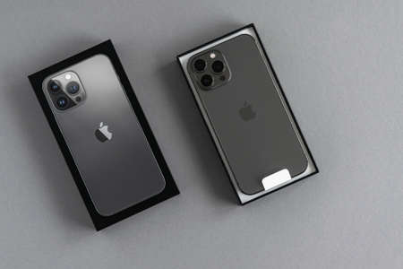 Minsk, Belarus - March 2022: Apple iPhone 13 Pro Max. The phone is new to the iPhone line. On a gray background.