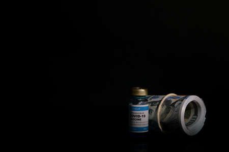 Coronavirus Covid-19 bottle vaccination and money banknotes over black background.