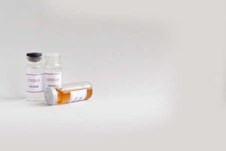 Coronavirus vaccine bottles on the table. Prevention and treatment from corona virus infection. Medicine infectious concept. Copy space for the text