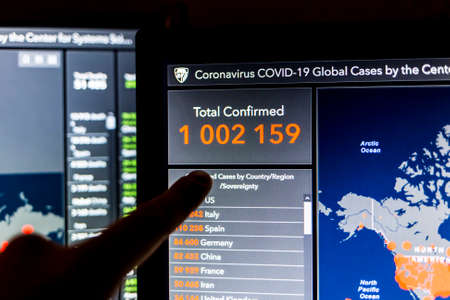 Over 1 million. Number of Total Confirmed Cases. Expert point Coronavirus COVID-19 global cases Map Johns Hopkins University map on monitor display.