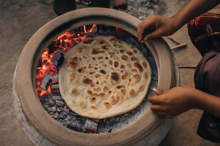 This image showcases a freshly made flatbread on a rustic surface, surrounded by steam and cooking elements, highlighting traditional preparation and culinary artistry.