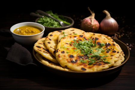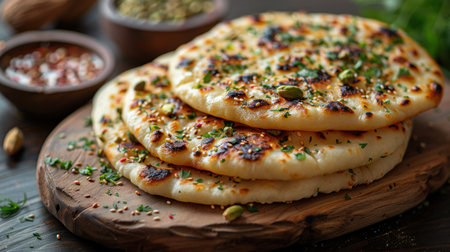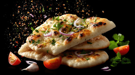 A stack of freshly baked naan bread garnished with herbs, spices, and vegetables. The image captures the texture and aroma, ideal for culinary themes.