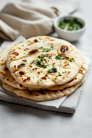 Delicious freshly baked naan served with butter and herbs, showcasing a perfect golden-brown crust. A scrumptious addition to any meal.