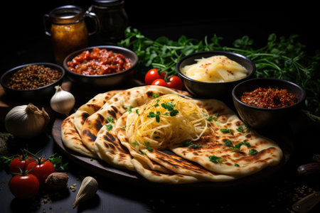 Indian naan bread with spices and herbs on a dark wooden background