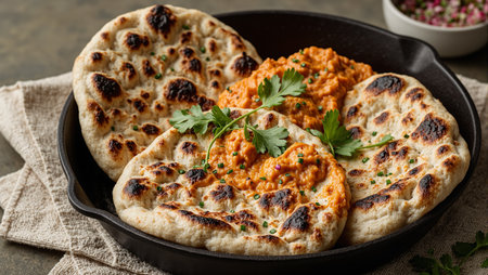Delicious naan bread in a cast iron skillet with butter chicken and cilantro Traditional Indian cuisine
