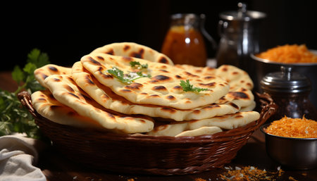 hand arranging freshly baked peshwari naan in a bread basket, created with generative ai