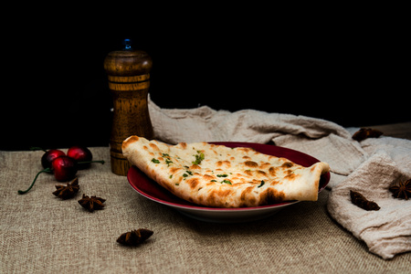 Indian cuisine. Khachapuri in wooden plate on wooden background
