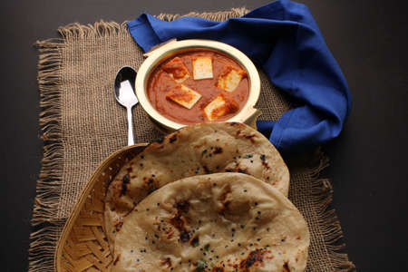 Paneer Butter Masala or Cheese Cottage Curry in serving a bowl or pan, served with naan or tandoori roti