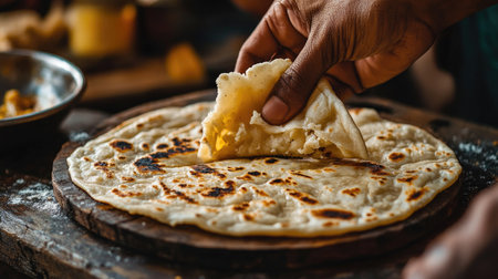 Close-up of a hand breaking apart a warm roti, revealing its soft, fluffy interior, set on a rustic table