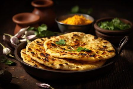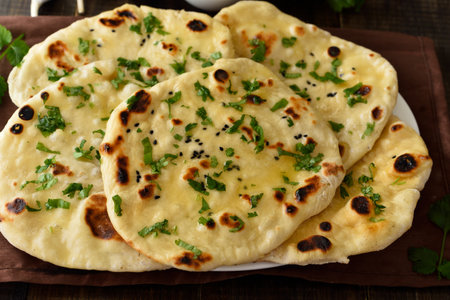 Garlic and coriander naan served in a plate, it's a type of Indian bread or roti flavoured with garlic