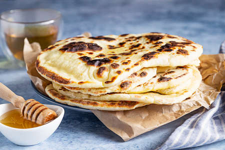 Stack of homemade crispy flatbread with honey and herbal tea, blue background.