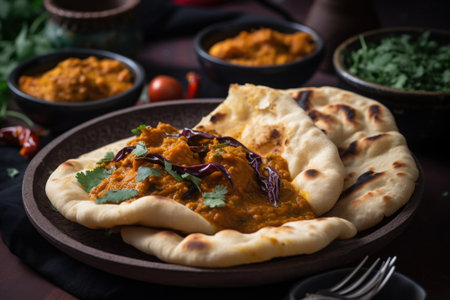 A delicious spread featuring freshly made naan bread served with flavorful curry and sauce. Perfect for showcasing Indian culinary delights and flavors.