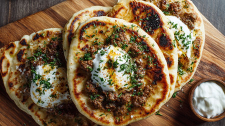 This image showcases warm, freshly made flatbread served with a creamy yogurt dip and topped with fresh herbs. Perfect for any meal or snack.