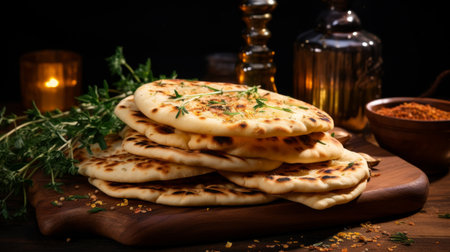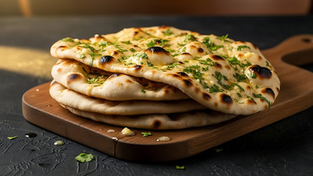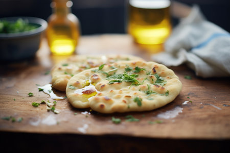 Savor the delightful taste of freshly baked naan, drizzled with herbal oil, served on a wooden plate for an authentic dining experience.