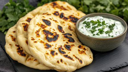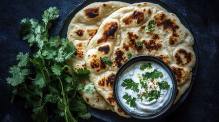 This image showcases freshly cooked naan served with yogurt and garnished with cilantro, highlighting the rich textures and flavors of traditional Indian cuisine.