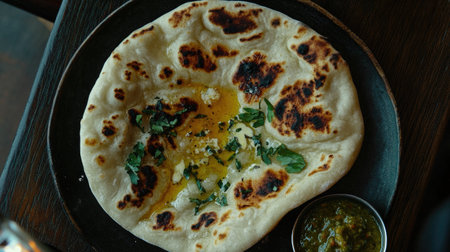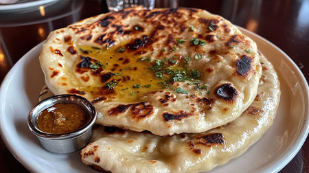 Soft and fluffy naan bread topped with butter and herbs, served with a side of flavorful sauce. Perfect for a cozy meal or as an appetizer.