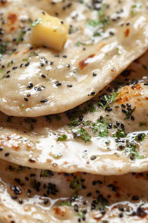 Close-up of fresh, hot tandoori roti or butter naan garnished with black till and green fresh coriander leaves. A typical, traditional north indian panjabi food.