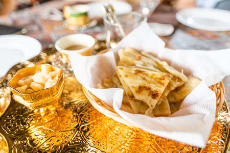 Grilled naan in the basket with tongs in dinning room of hotel in Darjeeling in winter, India.