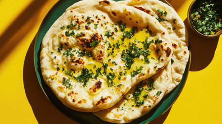 Enjoy freshly baked naan bread topped with butter and herbs, beautifully presented on a vibrant yellow background. Perfect for showcasing culinary delights!