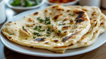A beautifully arranged plate of freshly baked naan bread, drizzled with garlic butter and topped with herbs, perfect for any dining occasion or culinary exploration.