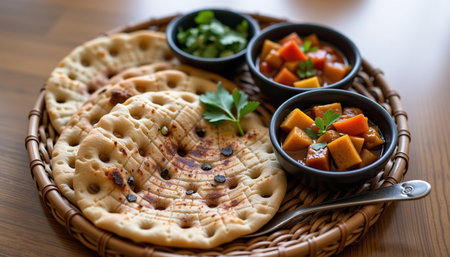 Indian flatbreads with spices and herbs on a wooden table.