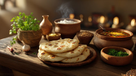 Experience the richness of Indian cuisine with freshly prepared naan, spices, herbs, and vibrant dishes arranged on a rustic wooden table, evoking warmth and tradition.