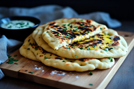 Warm naan bread sits invitingly on a handcrafted wooden board, topped with fresh herbs and served alongside a rich, creamy dip. Its golden, charred edges suggest a deliciously smoky flavor.