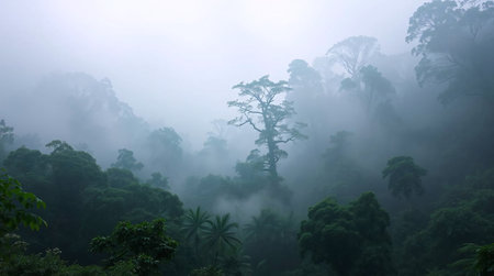 Serene foggy jungle landscape featuring dense ancient trees and lush greenery under soft golden morning light in a tropical environment