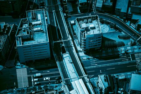 Urban core in Tokyo, Japan. Railway tracks with buildings. High angle view. Turquoise colors