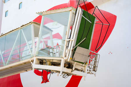 Mobile passenger gangway next to a cruise. Close-up. Malaga, Spain - June 01, 2020.